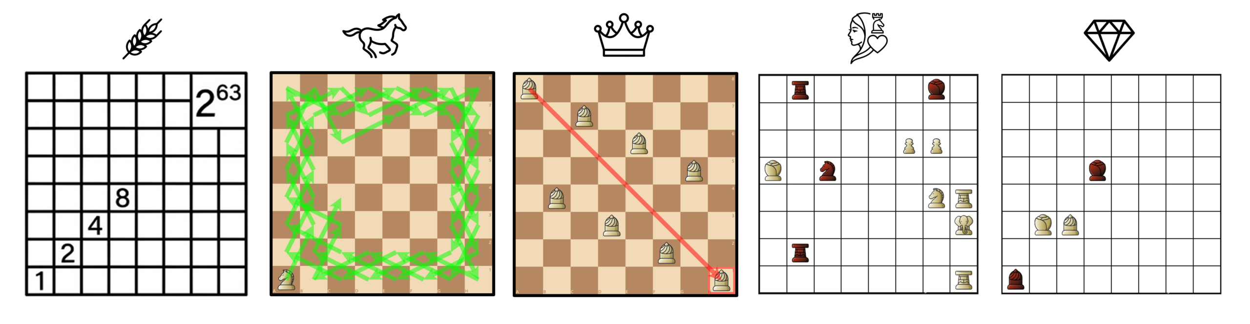 Wheat and the Chessboard, Horse Tour, Eight Queens, Dilaram Mate, Suli’s Diamond